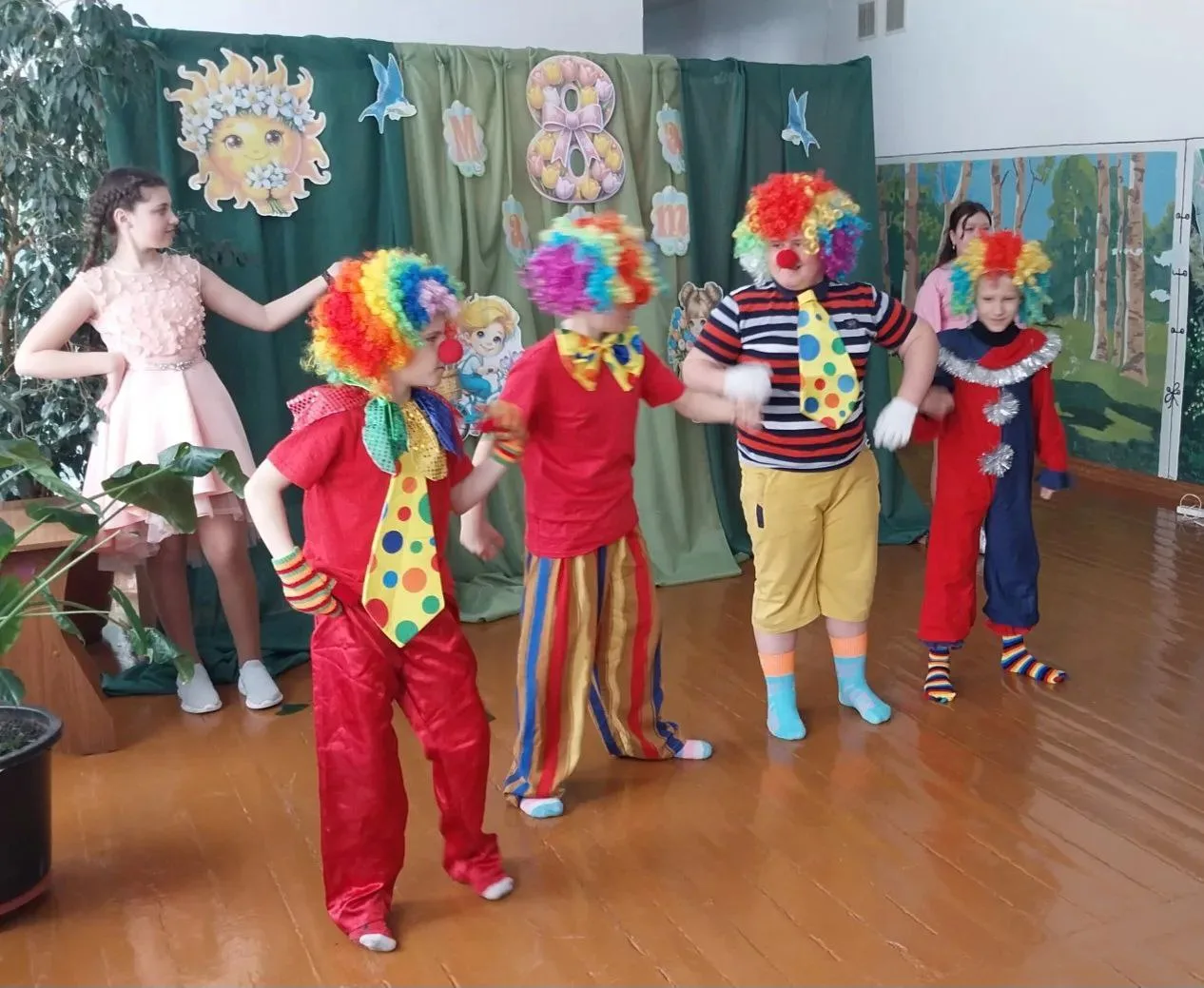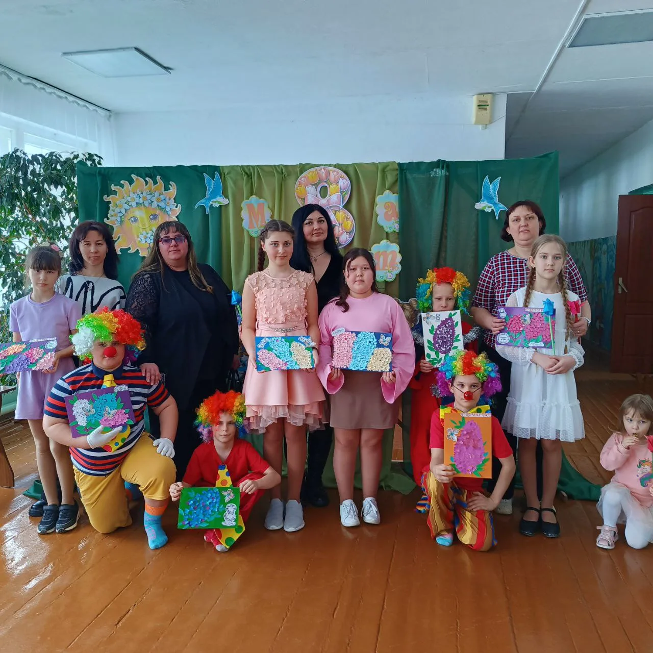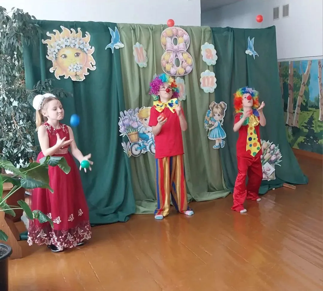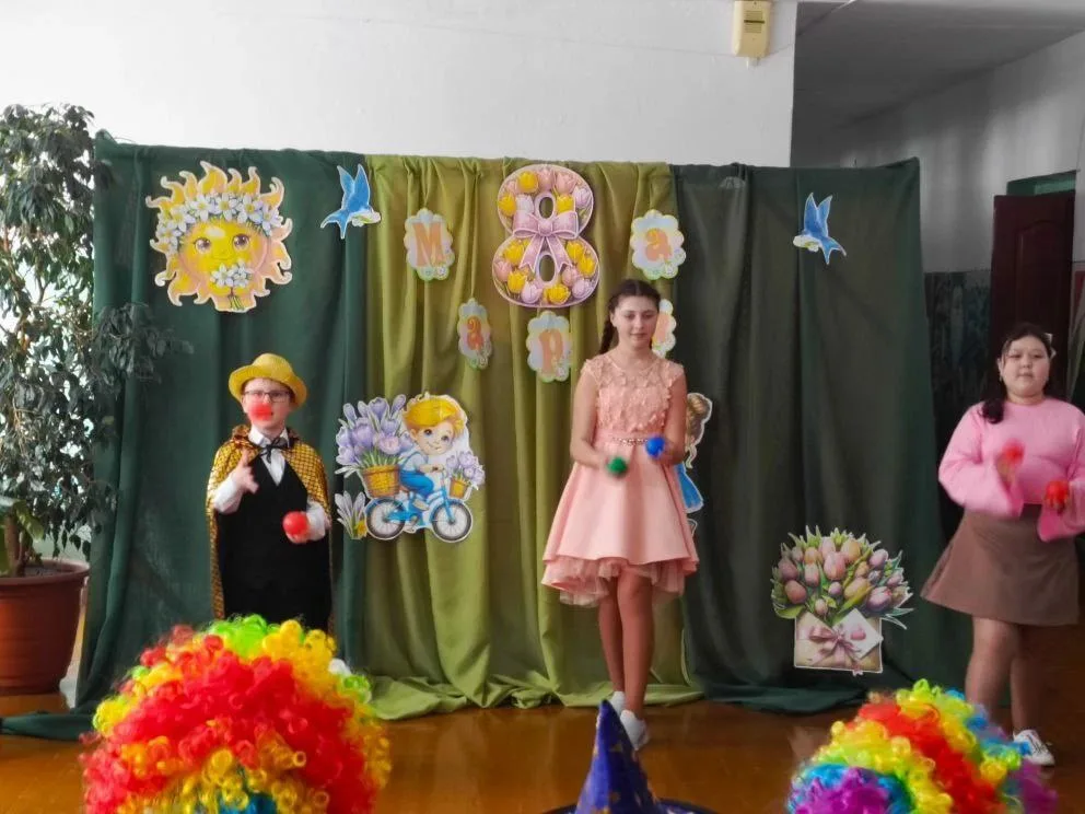 Завершилось мероприятие выступлением юных клоунов, устроивших шуточный гимнастический этюд, завершившийся трогательным вручением цветов, сделанных собственными руками, всем девочкам и мамам.